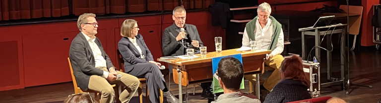 «Wirtschaft ohne Wachstum: Nachhaltig oder blauäugig?» Diese Frage steht auf dem Banner, das am Podiumstisch hängt. Sie ist das Thema des Diskussionsabends – und interessiert. Immer mehr, vor allem junge Menschen strömen am Mittwochabend, 13. November 2024, ins Palace in St.Gallen, so dass kurz vor Veranstaltungsbeginn zusätzliche Stühle aufgestellt werden. Zu Gast ist zum einen Niko Paech, Professor im Bereich Plurale Ökonomik an der Universität Siegen. Er ist einer der profiliertesten Wachstumskritiker Europas und wurde mit seinem Buch «Befreiung vom Überfluss» zum Vordenker der Postwachstumsökonomie im deutschsprachigen Raum. Zum anderen nehmen Franziska Ryser, Nationalrätin der Grünen, und Mitte-Ständerat Benedikt Würth mit kurzen Repliken und im anschliessenden Gespräch Stellung zu Paechs Thesen. Die Veranstaltung ist Teil der öffentlichen Vortragsreihe Focus PHSG und in Kooperation mit der Erfreulichen Universität entstanden. Moderiert wird das Podium von Rolf Bossart, Dozent an der Pädagogischen Hochschule St.Gallen (PHSG).