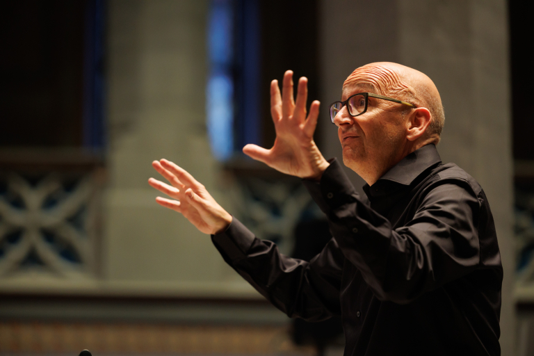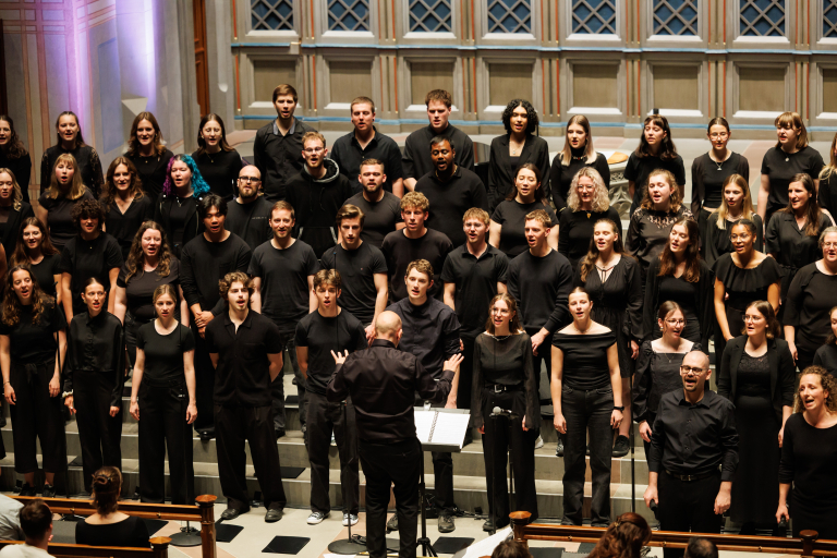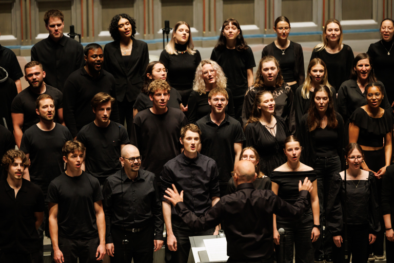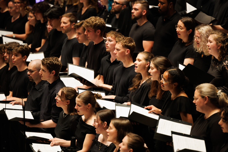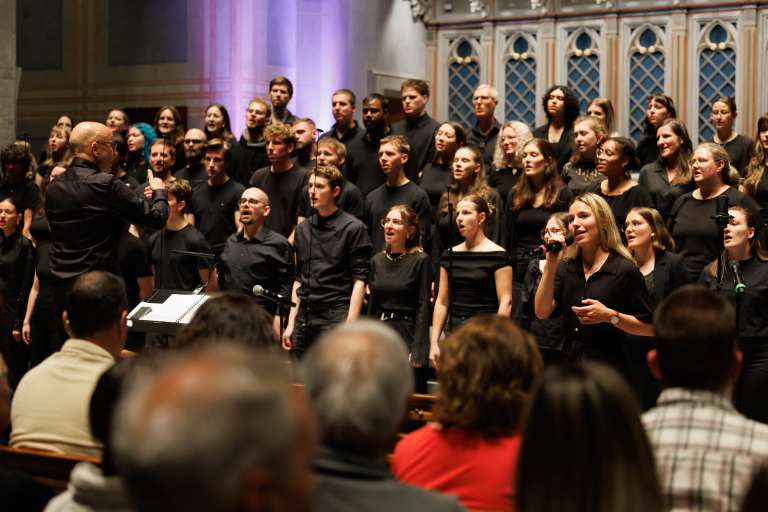 Dirigent steht vor dem Chor und dirigiert