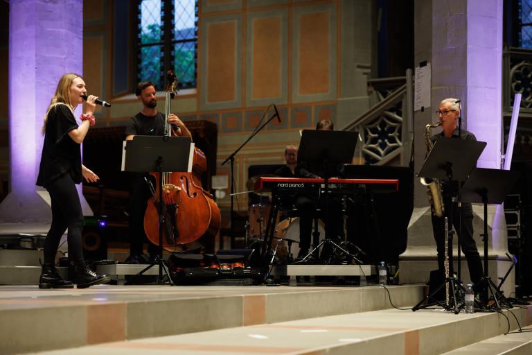 Ein Chor singt und ein Musiker spielt Saxophon