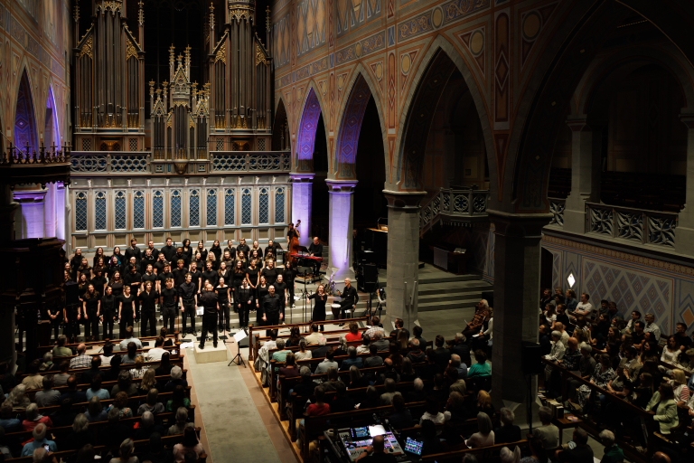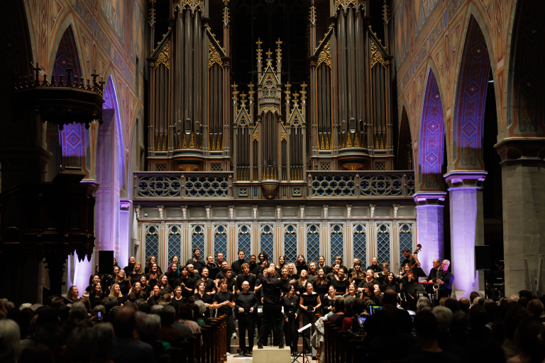 Chor singt vor einer grossen Kirchenorgel